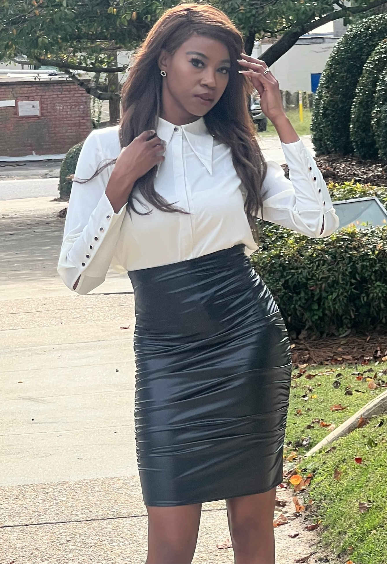 Command attention without saying a word. The All About Business Button Up collar shirt brings boardroom polish with after-hours attitude -- structured, soft, and cut to flatter every curve.