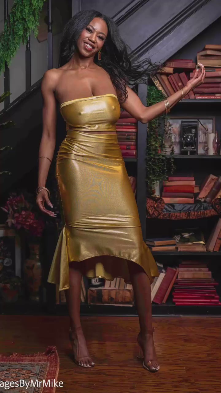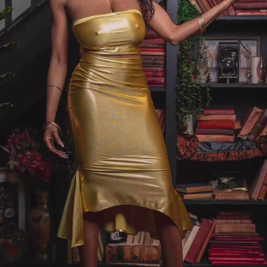 Turn every entrance into a moment with this stunning custom two-piece designed to celebrate confidence, curves, and unapologetic femininity. Featuring a sleek strapless bandeau top paired with a curve-hugging midi skirt, this set is crafted in a luxe, high-shine metallic fabric that catches the light from every angle. The ruched detailing enhances your natural shape, while the flirty flared hem adds movement and a touch of romance — perfect for date nights, special events, and unforgettable Valentine’s moments.