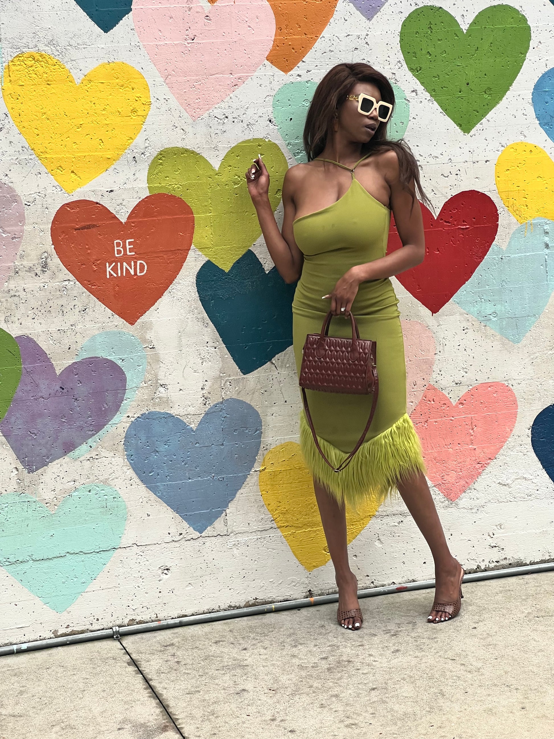 Unleash your IT girl in you with our Sexy Backless Slim Fit A-line midi dress! This stunning piece features a flirty shoulder-hanging neck design and a playful fur frayed hem, perfect for spring and end of summer escapades. Whether it’s a beach party or a romantic dinner, this chartreuse green dress will have all eyes on you. Pair it with neutral/nude heels and handbag for a neutral glam chic look, or pair it with a popping color shoe and bag combo to elevate your look and stay on their necks!